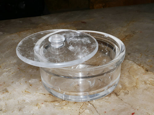 水晶器皿由天然水晶熔炼而成,高温状态稳定,完全环保,符合人们对自然环保的追求。其主要成分为二氧化硅(sio2),含量达99.8%以上,结构非常稳定,久烤不变形、不变色。耐强酸、强碱,在较高温度下,放入冷水中也不会损坏。