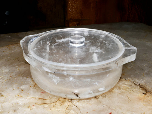 因天然水晶开采出来本身带有石纹和空隙,这样的原料是不适宜制作餐具器皿的,在高温烹煮的情况下容易爆裂,而且完全没有石纹干净洁净的天然水晶个头越大价格越贵,例如市面上一个8公分全净体水晶球市场价已经好几万,无法实际应用在餐具制作。那如何能保证安全和功效又价格实惠呢?师傅们经过摸索和反复实验发现将天然水晶高温高压熔炼提纯后再制作成餐具器皿正好可以很好的满足需求,3吨的天然原料经过熔炼加工后可获得1吨左右提纯水晶,为区别于天然水晶,其原料被业内称为熔炼水晶,并且保留了天然水晶的能量和矿物质,可以耐受1900度高温,相当于火山熔岩的温度。
