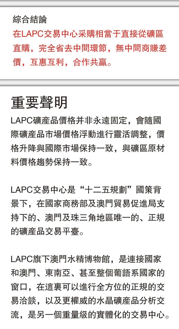 LAPC交易中心是“十二五規劃”國策背景下,在國家商務部及澳門貿易促進局支持下的,澳門及珠三角地區唯一的、正規的礦產品交易平臺。