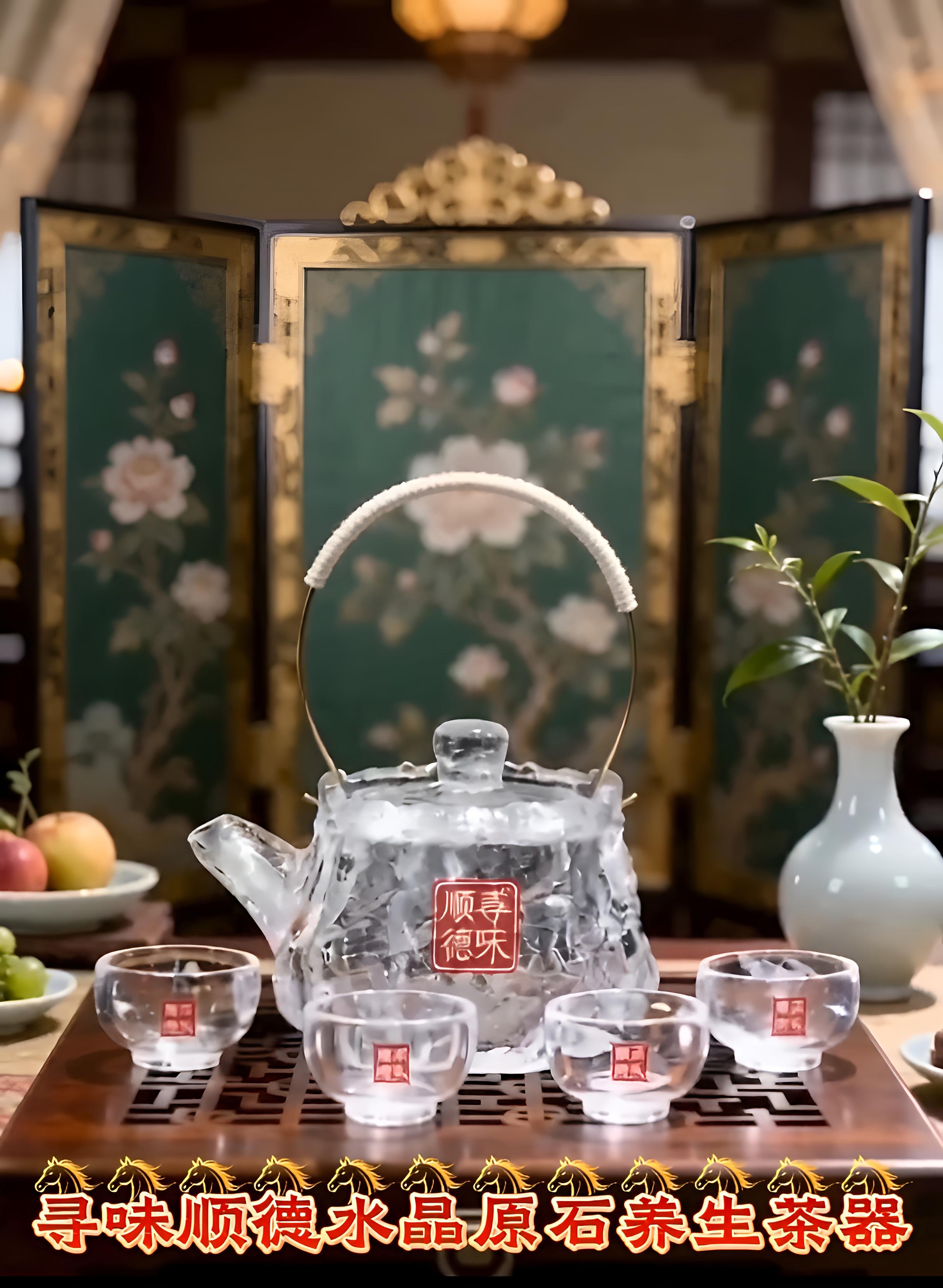 第三,新闻视角下的“实用主义美学”评述。 在当下的茶器市场,行业普遍存在“重艺术轻实用”的倾向。而这组画面及影片的新闻价值在于,它敏锐地捕捉到了消费回归理性的趋势。 画面中没有刻意回避水晶原石的非完美肌理,反而通过微距特写强调其天然的冰裂与内含物,这恰是“实用性”的视觉隐喻——真正的养生源自自然,而非工业流水线的完美抛光。通过AI古风影片的渲染,将坚硬的晶体质感与柔和的茶汤气息相融合,打破了“水晶只适合做首饰”的刻板印象,确立了其在茶道实用器皿中的独特品类地位。